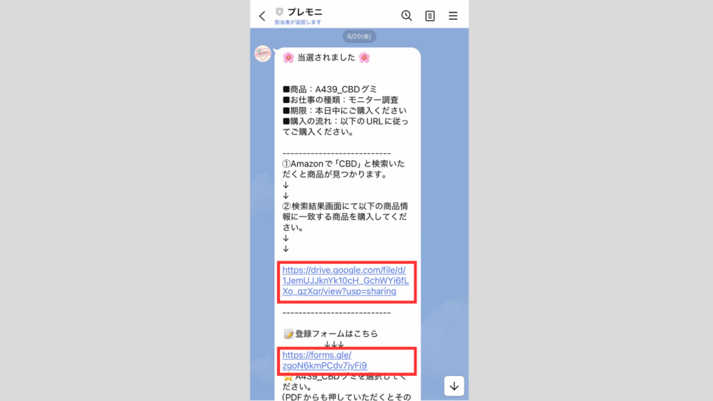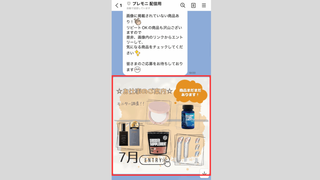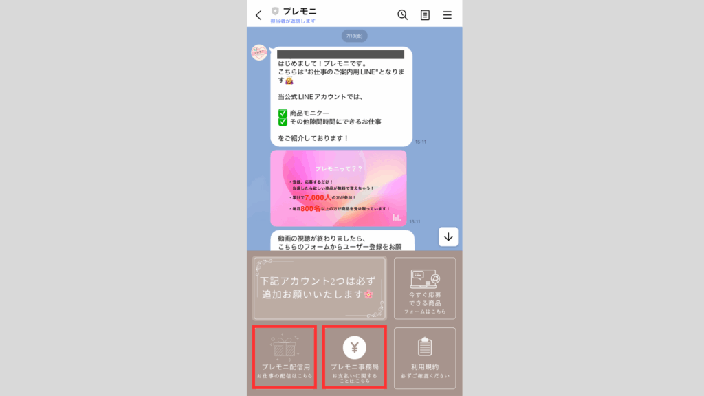 まずは、モニター提供企業のプレモニの公式ラインを登録します。動画とフォームが送信されてきますので、視聴・入力が完了しましたら、LINEにて報告します。