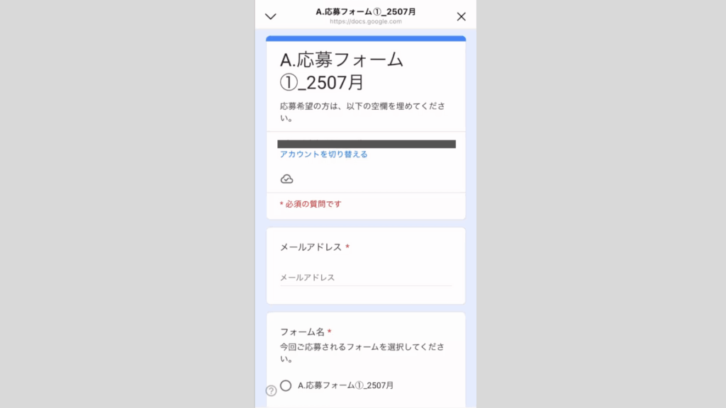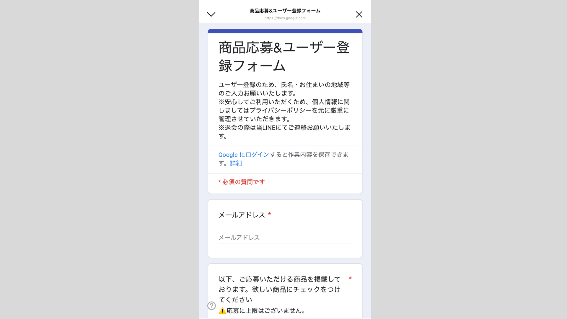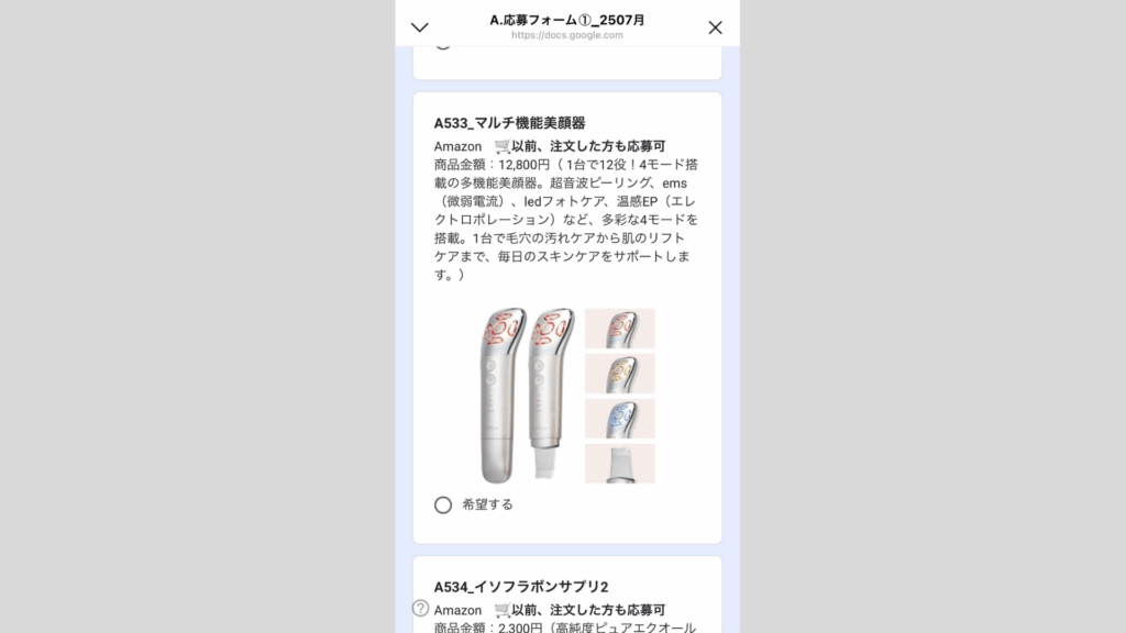 毎月、モニター案件募集の通知が一度届きますので、画像をタップしてGoogleフォームを開きます。