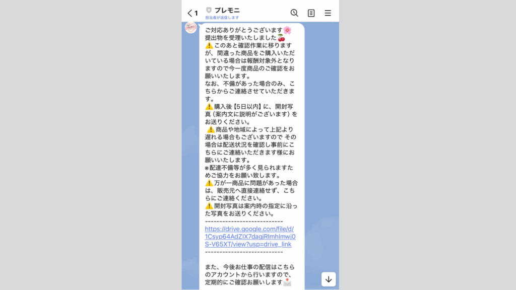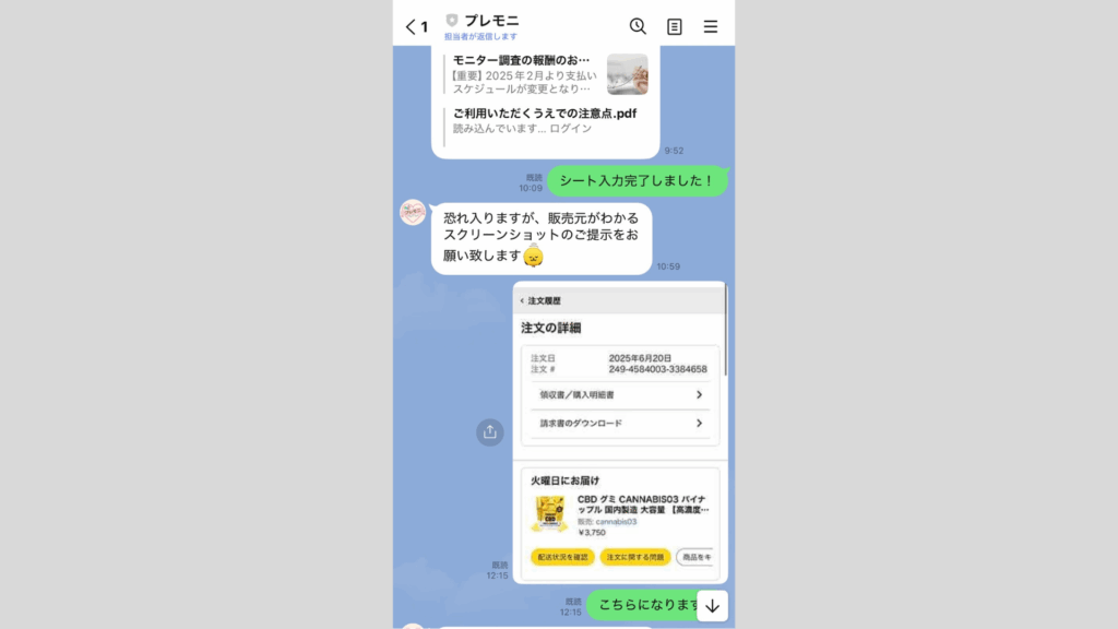 モニター案件が無事完了すると、「プレモニ事務局」のアカウントから、報酬確認連絡が届きます。内容に間違いが無いか確認します。