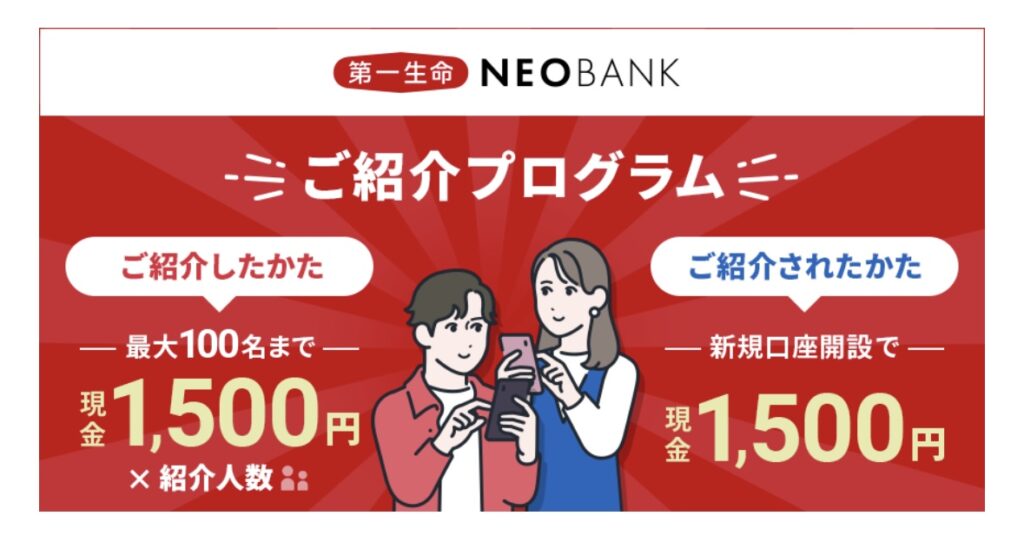 第一生命NEOBANKは、住信SBIネット銀行と第一生命保険が提供する銀行サービスです。NEO BANKに登録すると今なら1,500円もらえます。さらに、友達や家族に紹介すると、紹介ボーナスとして1人あたり1,500円がもらえます。